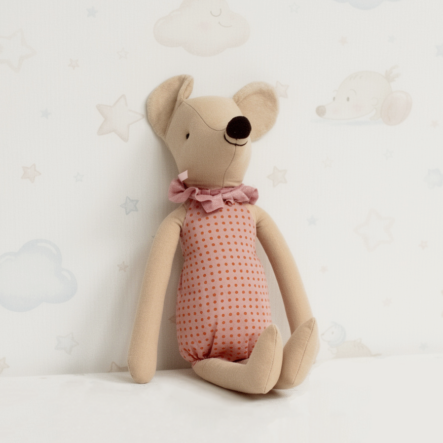 Bibi è piccola, buffa e piena di sorprese. Con il suo colletto rosa sembra uscita da un ballo elegante ma attenzione... è la regina delle risatine. Ama nascondersi tra i cusicini e raccontare storie facendo le voci. Com Bibi ogni giorno è una piccola festa.